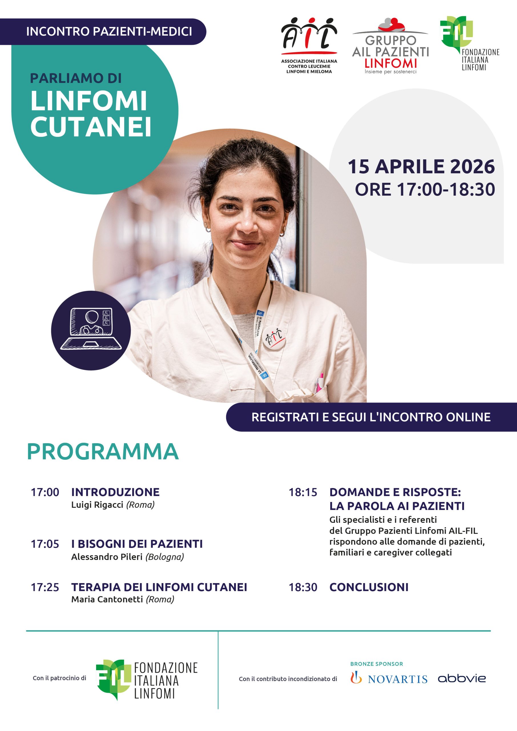 Si tiene online l’Incontro Pazienti-Medici – Parliamo di Linfomi Cutanei del 15 aprile 2026 dalle ore 17.00 alle ore 18.30, organizzato dal Gruppo Pazienti Linfomi AIL FIL.